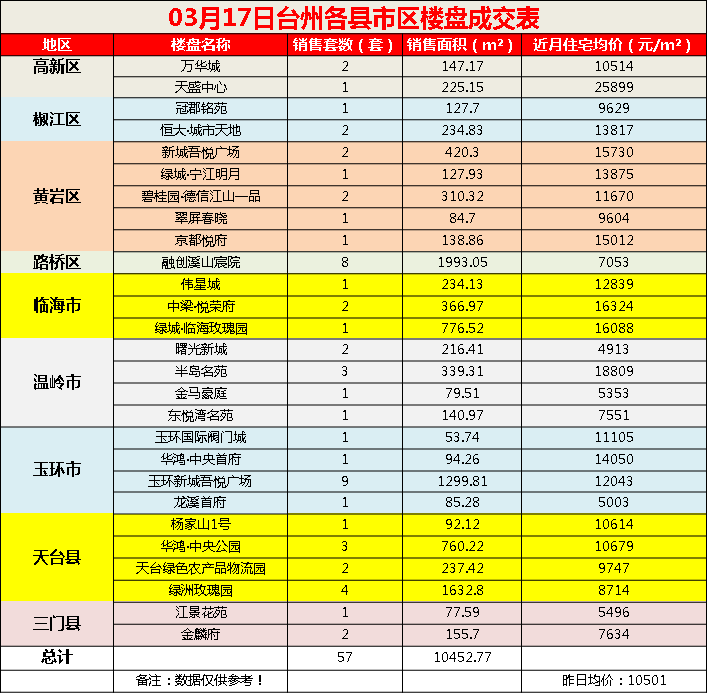 2018年3月17日臺(tái)州市一手住宅成交57套
