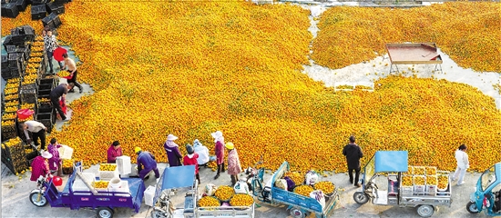 11月25日 各地客商收購三門柑橘的場景 登上《浙江日報》頭版 當前正值三門柑橘上市旺季,各地客商前來收購,幫助果農(nóng)實現(xiàn)就地銷售。圖為三門縣浦壩港鎮(zhèn)圩岙村的收購現(xiàn)場,果農(nóng)們忙著交易。林利軍/ ...