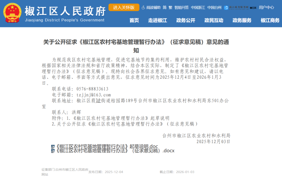 12月4日,椒江區(qū)人民政府發(fā)布關(guān)于公開征求《椒江區(qū)農(nóng)村宅基地管理暫行辦法》(征求意見稿)意見的通知,并向社會(huì)各界征求意見。 如有意見和建議,請(qǐng)以電話、電子郵箱、書面等方式提出意見,征求意見時(shí)間為2 ...