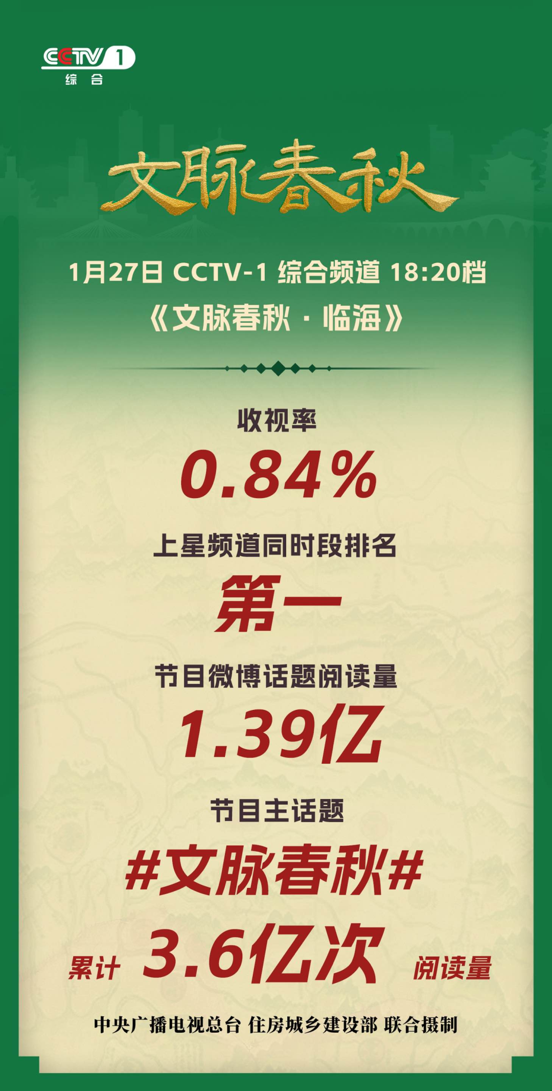 日前,央視綜合頻道(CCTV-1)18:20黃金檔播出紀(jì)錄片《文脈春秋·臨?!罚瞄L達(dá)30分鐘的時(shí)間,帶我們領(lǐng)略這座山海間造就的千年古城——臨海。據(jù)央視綜合頻道統(tǒng)計(jì),該期節(jié)目收視率在全國上星頻道同時(shí)段排名第一,節(jié) ...