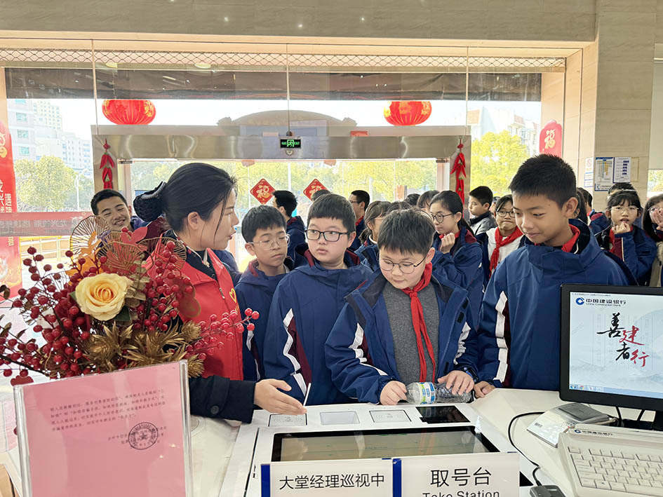 “阿姨,錢是怎么出來的?”“我沒有銀行卡可以存錢嗎?”“我的銀行卡我媽媽幫我保管,不告訴她密碼她能取走我的壓歲錢嗎?”……2月的一天,建行浙江臺州溫嶺支行的營業(yè)大廳內(nèi)擠滿了一堆戴著紅領(lǐng)巾的中學(xué)生們,好奇心驅(qū)使著他們摸摸這、摸摸那,嘰嘰喳喳,好不熱鬧。為了提升中小學(xué)生的金融素養(yǎng),豐富和拓展學(xué)生視野,溫嶺建行與溫嶺市第三中學(xué)合作開展了主題為“以實踐洞察職業(yè)、以未來塑造人生”的社會實踐活動,邀請溫嶺市第三中學(xué)初一年級段的學(xué)生們到溫嶺建行進行參觀學(xué)習(xí)。