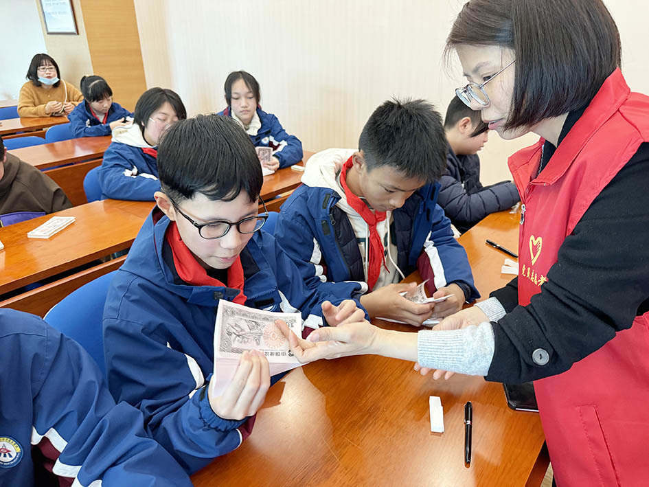 同學(xué)們興致高昂,問題一拋出來就嘰嘰喳喳地討論開了。為了滿足同學(xué)們的好奇心,建行志愿者現(xiàn)場準(zhǔn)備了幾套人民幣的樣鈔,交給學(xué)生們傳閱展示,并為每位學(xué)生準(zhǔn)備了練功券,一對一教授學(xué)生們點鈔手勢和技巧。
