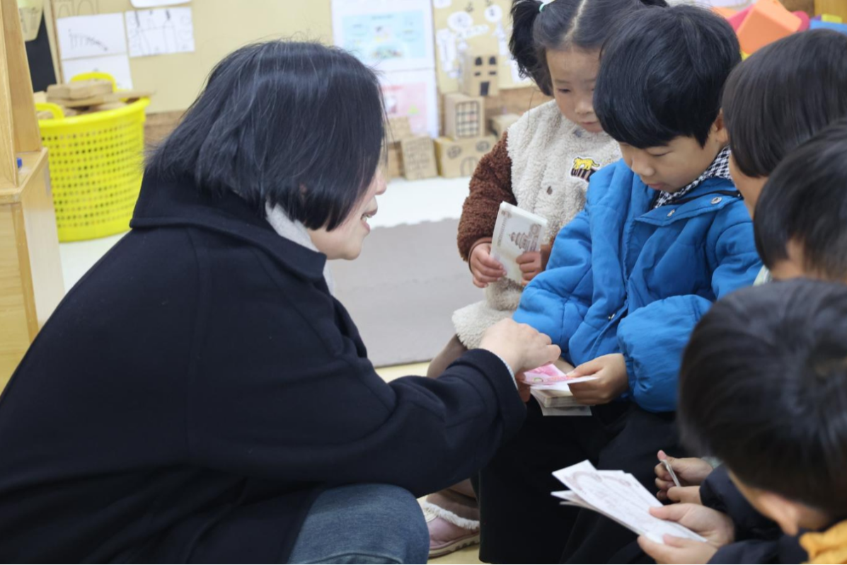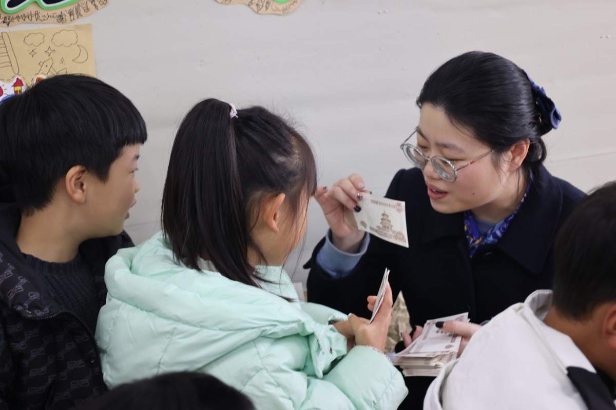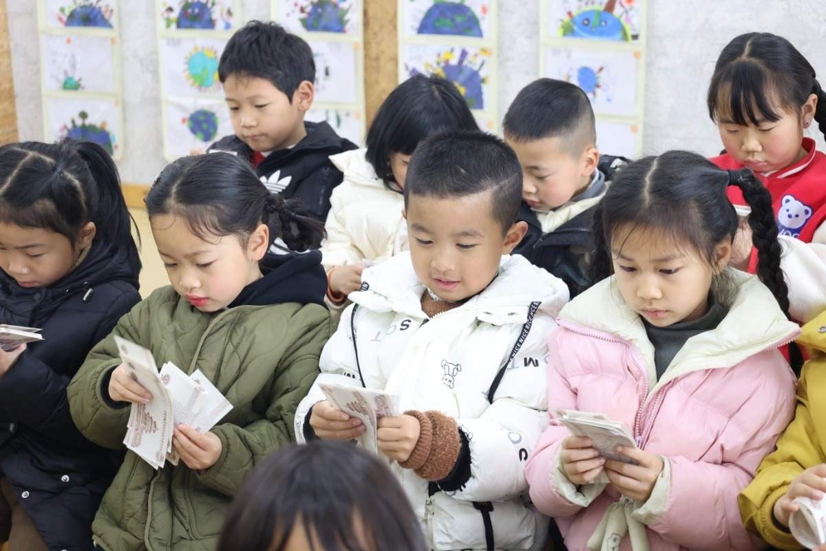 “將紙幣放于左手中指和無名指之間大拇指反向按壓,右手的大拇指和食指進(jìn)行向內(nèi)點(diǎn)數(shù)紙幣。”“我來,我來?!被顒?dòng)中穿插趣味問答與點(diǎn)鈔環(huán)節(jié),小朋友們各自領(lǐng)到一疊練功券,紛紛欲試。建行工作人員大顯身手,耐心講解,通過融學(xué)于趣的方式讓“小小銀行家們”積極參與其中,現(xiàn)場(chǎng)熱火朝天、氛圍高漲。