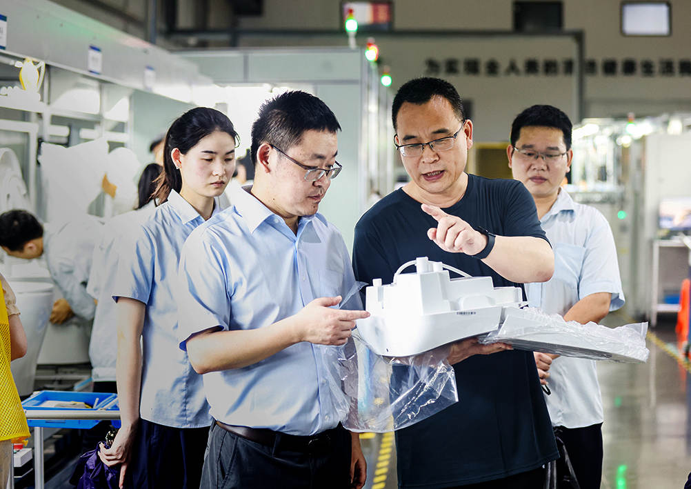 ▲ 建行臺(tái)州分行黨委書記、行長(zhǎng)任建軍(左二)走訪國(guó)家高新技術(shù)企業(yè)浙江怡和衛(wèi)浴有限公司,在整機(jī)車間內(nèi)查看智能馬桶蓋機(jī)芯。