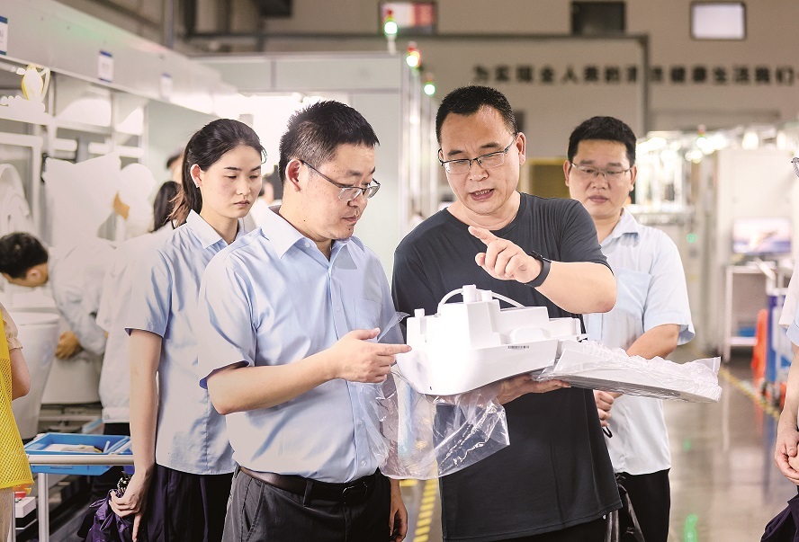 建設(shè)銀行臺(tái)州分行黨委書(shū)記、行長(zhǎng)任建軍(左二)走訪國(guó)家高新技術(shù)企業(yè)浙江怡和衛(wèi)浴有限公司,在整機(jī)車間查看智能馬桶蓋機(jī)芯。