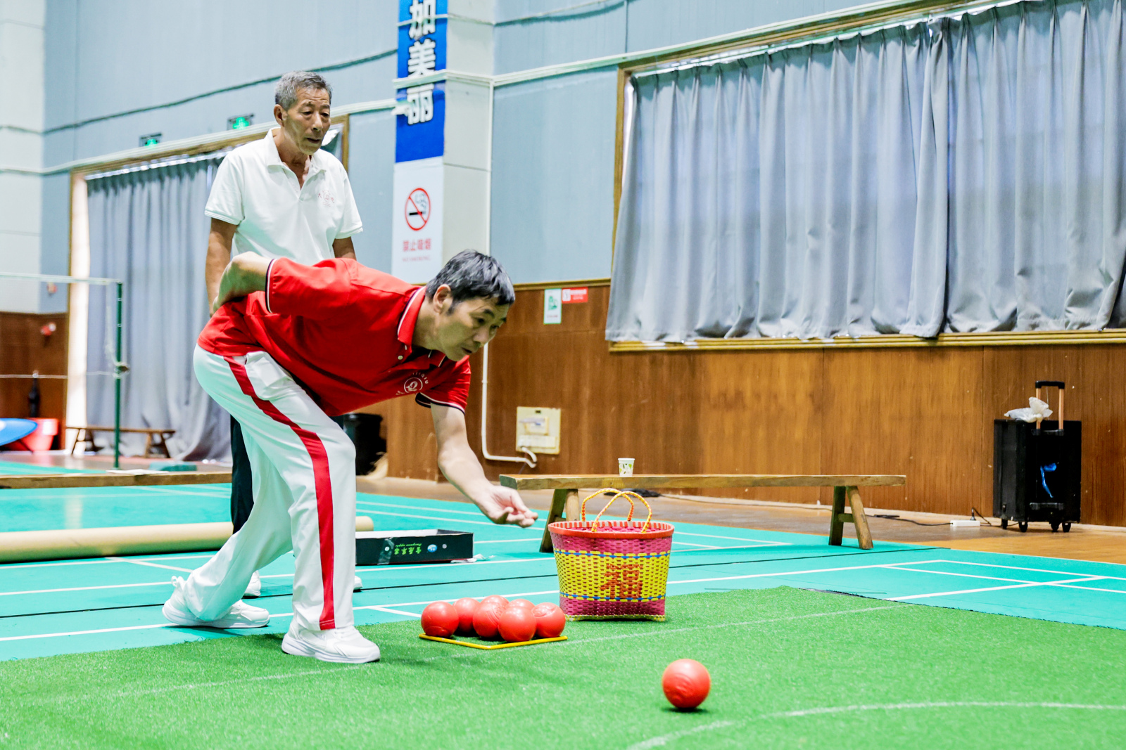 本屆嘉年華首次將銀齡群體作為體育大會核心單元,通過低強(qiáng)度項(xiàng)目設(shè)計、康養(yǎng)文化融合,為全省老年體育推廣提供范本。期間,嘉年華聚焦地?fù)羟蚺c兜球賽事,其中地?fù)羟蛸悎霾捎谩?89組合賽制”,選手需在4米、5米線完成拋球積分,考驗(yàn)穩(wěn)定性與策略;而兜球混合團(tuán)體賽則通過五場三勝制決出勝負(fù),其中30秒快投環(huán)節(jié)扣分規(guī)則嚴(yán)謹(jǐn),未按時投完將倒扣分值?!耙?guī)則弱化競技排名,強(qiáng)化參與感,確保老人安全完賽?!钡?fù)羟虿门虚L齊碧君表示。