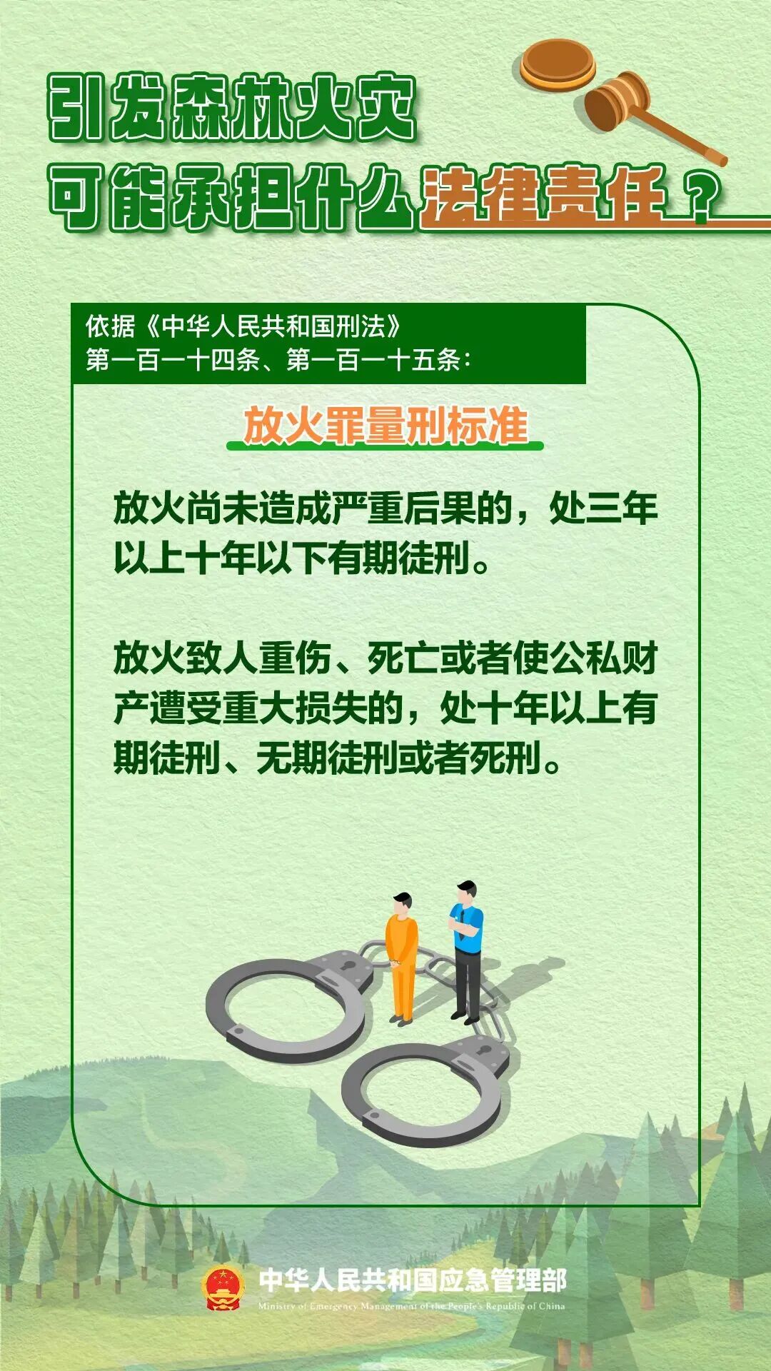 野外防火責(zé)任重大 林區(qū)一旦發(fā)生人為 或過失引起的火災(zāi) 責(zé)任人必將受到法律嚴懲! 一圖看懂森林火災(zāi)的罪與罰