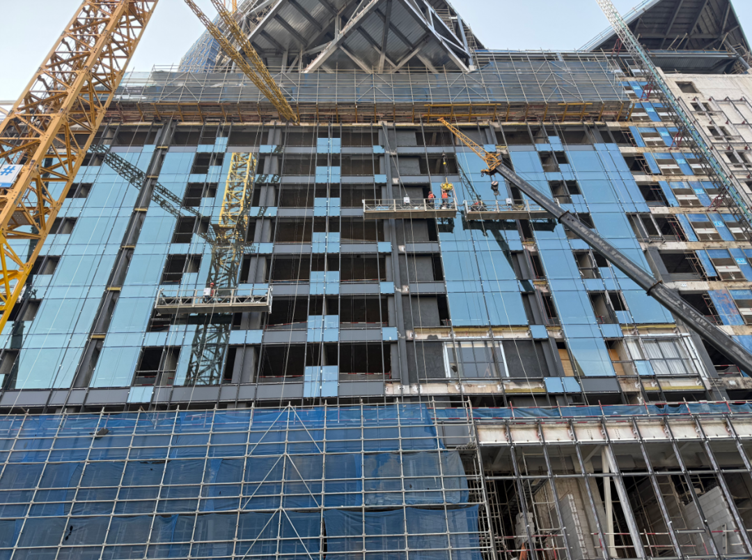 靈湖之畔,希爾頓酒店項目施工現(xiàn)場,機械的轟鳴聲、工具的敲擊聲交織在一起,奏成一曲激昂的建設之歌。高聳的機械吊臂在空中勾勒出絢麗軌跡,將建筑材料緩緩吊起,精準運送至指定位置。160余名施工人員,有的在高空安裝玻璃幕墻,有的在地面實施新建地下室車庫、粗裝修、室內安裝等施工。