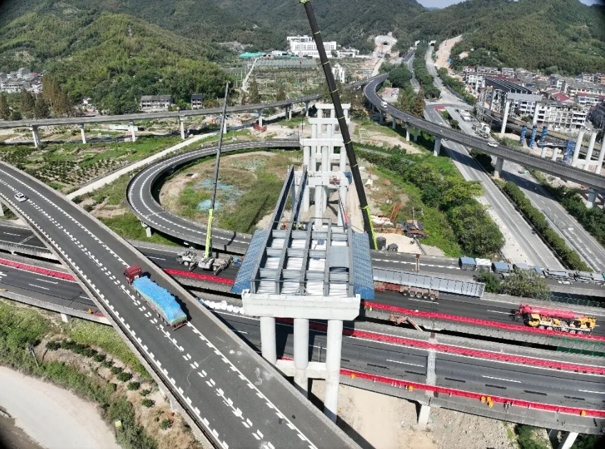 于奔流之上,精準(zhǔn)導(dǎo)改促建設(shè) 時(shí)間回?fù)苤辽钋锏?0月29日。當(dāng)最后一榀重達(dá)649.2噸的鋼梁穩(wěn)穩(wěn)落位,跨臺(tái)金高速主線首跨鋼板疊合梁宣告吊裝成功?,F(xiàn)場(chǎng)短暫的靜默后,爆發(fā)出如釋重負(fù)的掌聲。這場(chǎng)被喻為“在流動(dòng)的鋼鐵長(zhǎng)城上起舞”的施工,以其“20個(gè)節(jié)段、8晝夜連續(xù)作業(yè)、8次交通導(dǎo)改”的交通轉(zhuǎn)換,最終實(shí)現(xiàn)了“安全零事故、通行零投訴”的佳績(jī)。