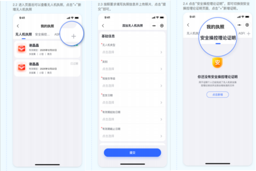 進(jìn)入頁(yè)面后可以查看無人機(jī)執(zhí)照,點(diǎn)擊“+”新增無人機(jī)執(zhí)照。