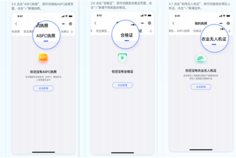 點(diǎn)擊“農(nóng)用無人機(jī)證”,即可切換到農(nóng)用無人機(jī)證,點(diǎn)擊“+”新增證件。