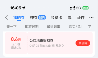 通勤卡包含10筆每筆0.6元早高峰乘車優(yōu)惠券
